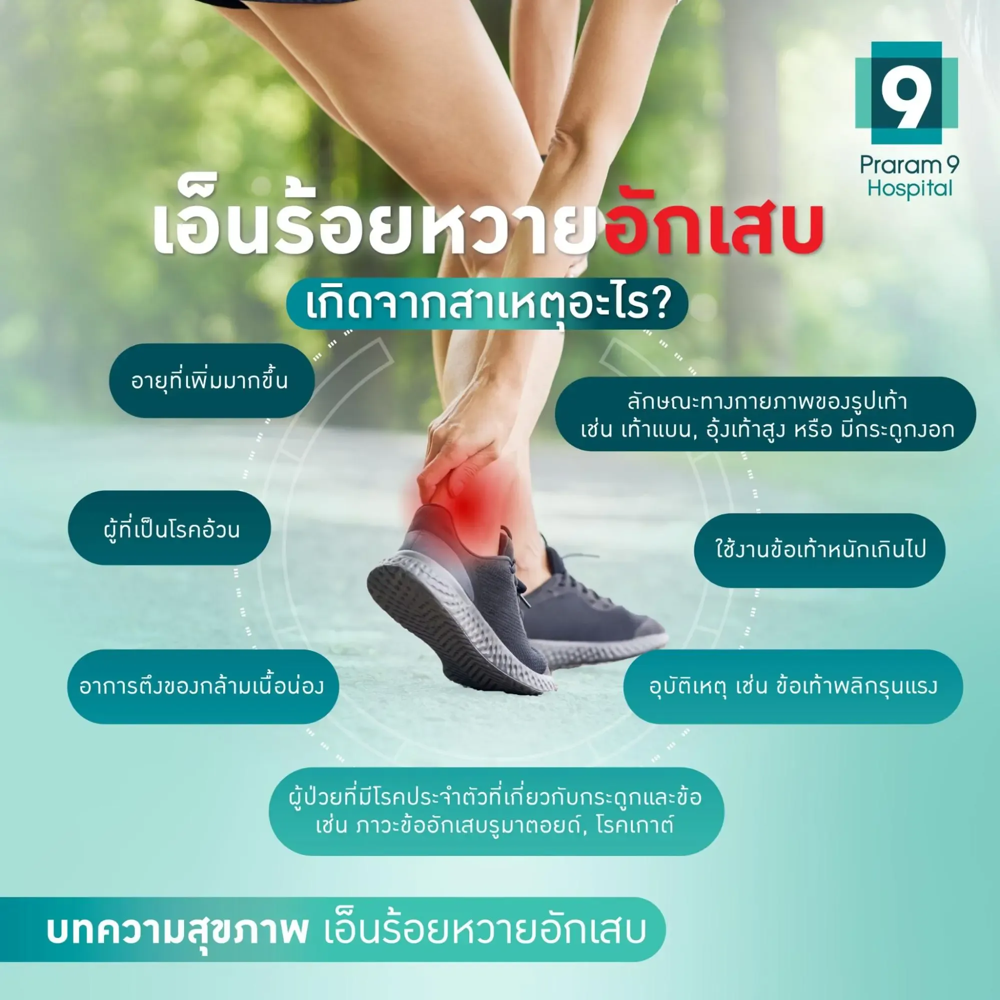 สำหรับผู้ที่กำลังมีอาการปวดข้อเท้า หรือสงสัยว่าอาจเกิดจากเอ็นร้อยหวายอักเสบ แนะนำให้เข้ารับการประเมินกับแพทย์เฉพาะทาง โดยเฉพาะที่ /ศูนย์กระดูกและข้อ โรงพยาบาลพระรามเก้า ซึ่งพร้อมให้บริการด้วยทีมแพทย์มากประสบการณ์ เครื่องมือวินิจฉัยที่แม่นยำ และแนวทางการรักษาที่ครอบคลุมทั้งแบบผ่าตัดและไม่ผ่าตัด เพื่อดูแลเอ็นร้อยหวายของคุณให้แข็งแรงและใช้งานได้อย่างมั่นใจในระยะยาว