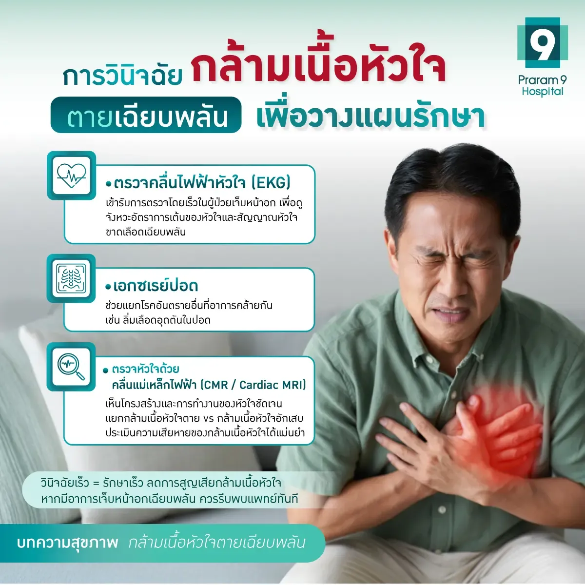 กล้ามเนื้อหัวใจตายเฉียบพลัน เป็นภาวะที่อันตรายถึงขั้นเสียชีวิตได้ทันที หากไม่ได้รับการรักษาที่ถูกต้อง การป้องกันสามารถทำได้ตั้งแต่เริ่มแรก อาทิ ควบคุมความดันโลหิต น้ำตาล งดสูบบุหรี่และแอลกอฮอล์ รับประทานอาหารที่มีประโยชน์ ออกกำลังกายสม่ำเสมอ ควบคุมน้ำหนัก ลดความเครียด และตรวจสุขภาพหัวใจเป็นประจำ หากมีอาการ เช่น เจ็บหน้าอก หายใจลำบาก หรือหมดสติ ควรรีบปรึกษาแพทย์ที่โรงพยาบาลพระรามเก้า ซึ่งมีทีมแพทย์เฉพาะทางด้านหัวใจ พร้อมเทคโนโลยีการวินิจฉัยและรักษาที่ได้มาตรฐาน เพื่อให้ทุกขั้นตอนเป็นไปอย่างรวดเร็ว แม่นยำ เพราะทุกนาทีสามารถทำให้การรักษาเป็นไปได้อย่างมีประสิทธิภาพ