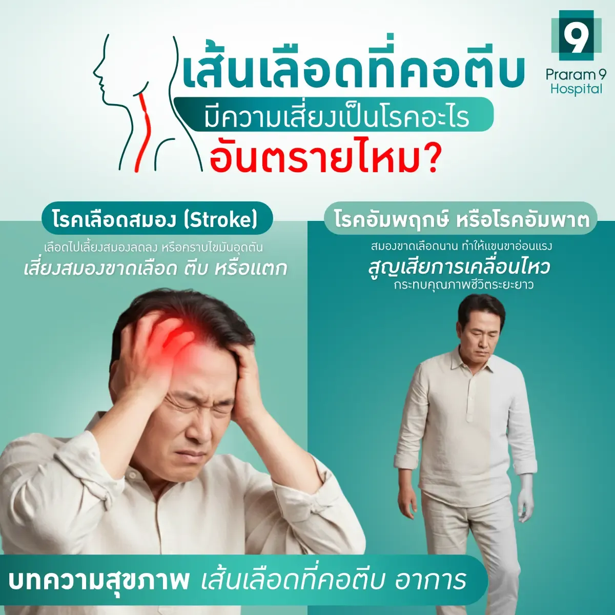 หากคุณหรือคนที่คุณรักมีอาการเส้นเลือดที่คอตีบ หรือต้องการประเมินความเสี่ยงหลอดเลือดสมอง โรงพยาบาลพระรามเก้าพร้อมให้คำปรึกษาโดยทีมแพทย์เฉพาะทางด้านโรคสมองและระบบประสาท พร้อมเทคโนโลยีการตรวจวินิจฉัยที่ทันสมัย แม่นยำ และหากมีอาการสามารถดูแลรักษาได้ทันที เพื่อให้คุณมั่นใจในทุกย่างก้าวของชีวิต