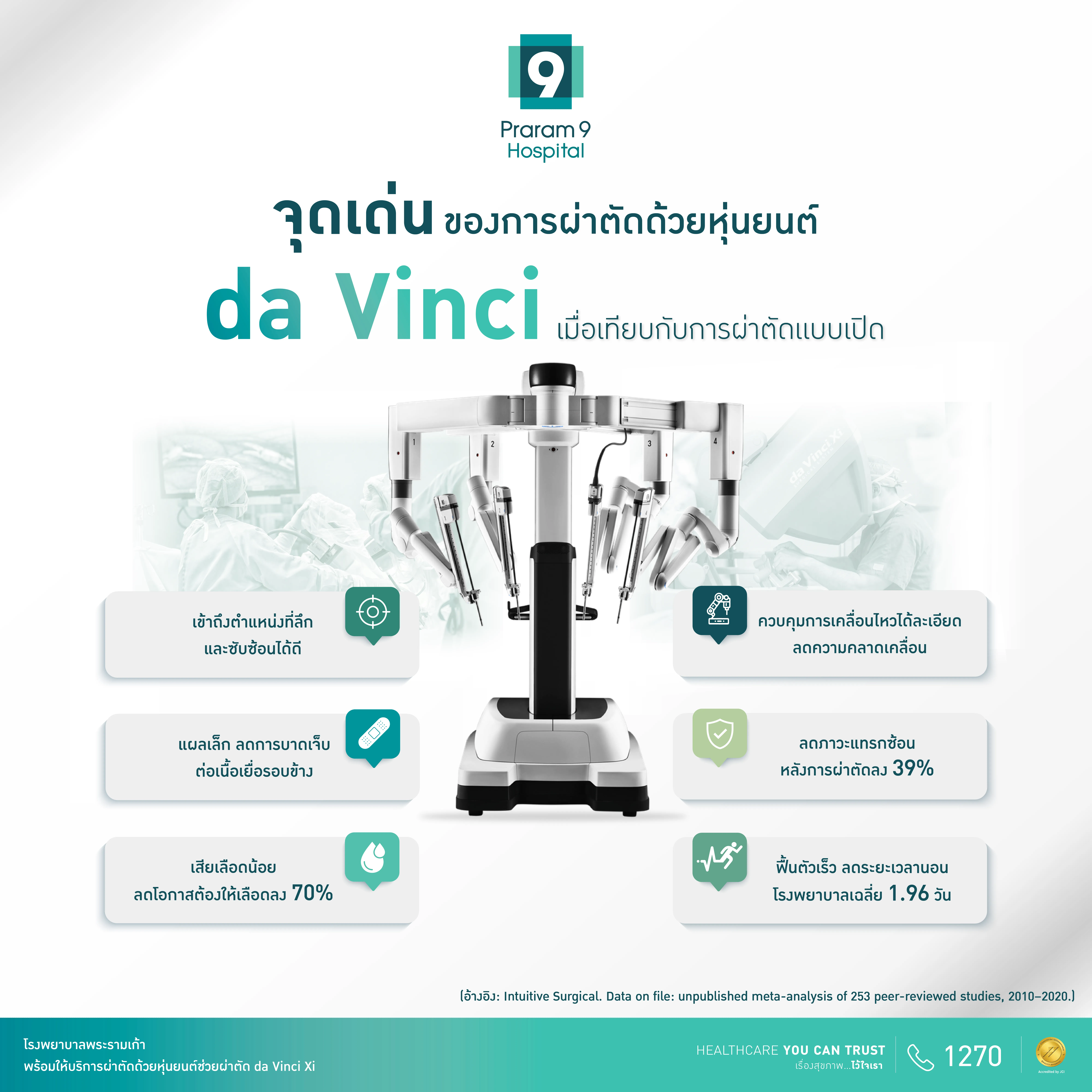 หุ่นยนต์ช่วยผ่าตัด da Vinci คือ เทคโนโลยีการผ่าตัดที่ถูกพัฒนาต่อยอดจากการผ่าตัดส่องกล้องแบบแผลเล็ก (Minimally Invasive Surgery) โดยศัลยแพทย์เป็นผู้ควบคุมทุกขั้นตอนของการผ่าตัดผ่านระบบคอนโซลและแขนกลความละเอียดสูง ระบบนี้ช่วยให้ศัลยแพทย์สามารถผ่าตัดในตำแหน่งที่ลึก แคบ หรือมีโครงสร้างซับซ้อนได้อย่างมีประสิทธิภาพ ลดการกระทบกระเทือนต่อเนื้อเยื่อรอบข้าง ลดการเสียเลือด และลดโอกาสเกิดภาวะแทรกซ้อนจากการผ่าตัด ส่งผลให้ผู้ป่วยมีอาการเจ็บปวดหลังผ่าตัดน้อยลง ฟื้นตัวได้เร็วขึ้น และสามารถกลับไปใช้ชีวิตประจำวันได้เร็วขึ้น ช่วยเพิ่มคุณภาพชีวิตของผู้ป่วยหลังการรักษา