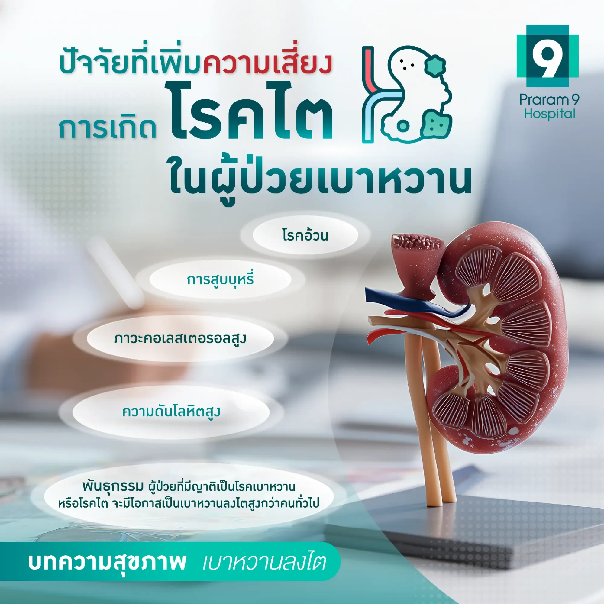 สถาบันโรคไต โรงพยาบาลพระรามเก้า เราใส่ใจและมุ่งมั่นในการดูแลสุขภาพผู้ป่วยเพื่อป้องกันโรคแทรกซ้อนอันตราย รวมถึงการให้คำแนะนำในการปรับพฤติกรรมการกินและการใช้ชีวิตที่ดี เพื่อช่วยให้ผู้ป่วยสามารถรักษาสุขภาพ ลดความเสี่ยงต่อโรคไตจากเบาหวาน และภาวะแทรกซ้อนต่าง ๆ ได้อย่างยั่งยืน