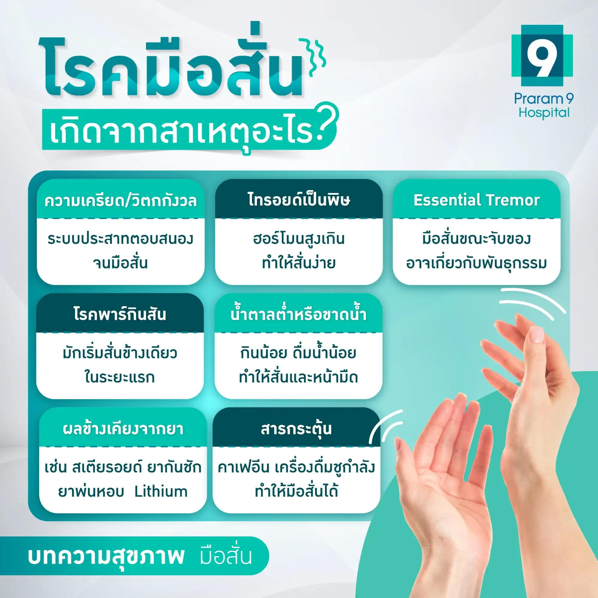 - สาเหตุสำคัญที่พบได้ ได้แก่ Essential Tremor, โรคพาร์กินสัน และภาวะไทรอยด์เป็นพิษ