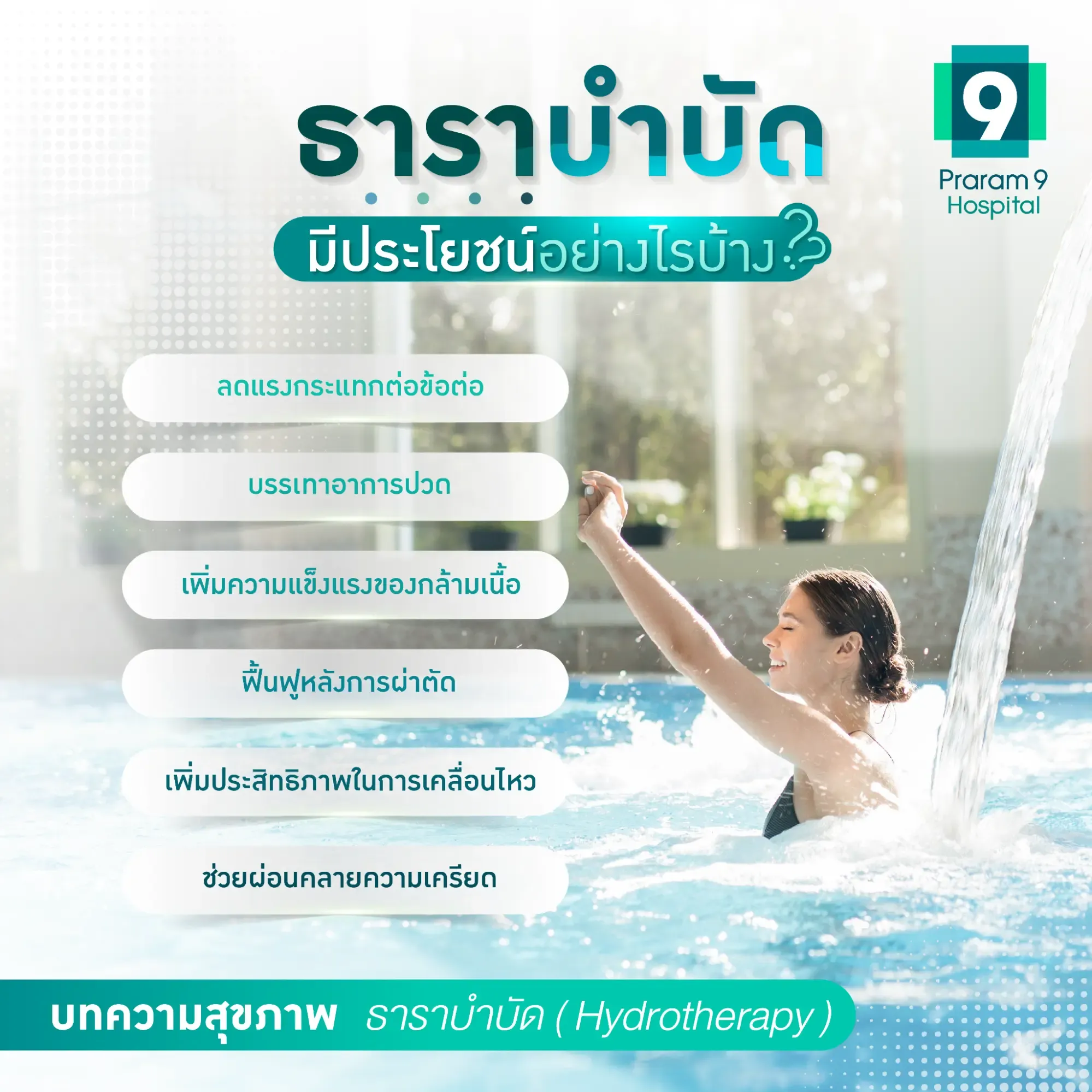- การทำธาราบำบัดจะช่วยบรรเทาอาการปวดเรื้อรัง เพิ่มประสิทธิภาพในการเคลื่อนไหว และฟื้นฟูร่างกายหลังการผ่าตัดให้ดียิ่งขึ้น