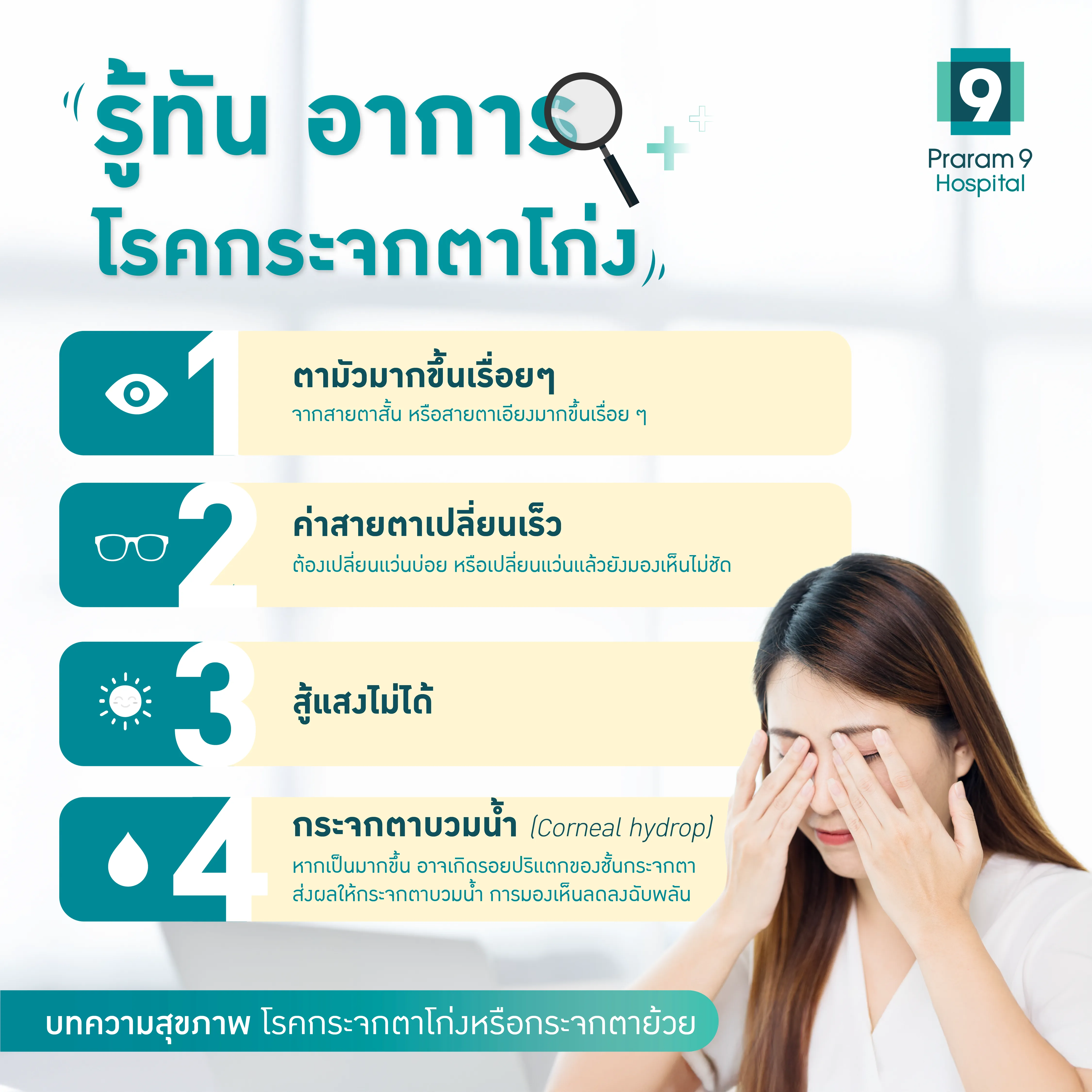 หากคุณหรือคนใกล้ตัวมีอาการสายตาสั้น สายตาเอียงมากขึ้น มองเห็นไม่ชัด หรือเปลี่ยนแว่นบ่อย ควรรีบปรึกษาจักษุแพทย์เพื่อรับการตรวจวินิจฉัยและดูแลรักษาอย่างเหมาะสม