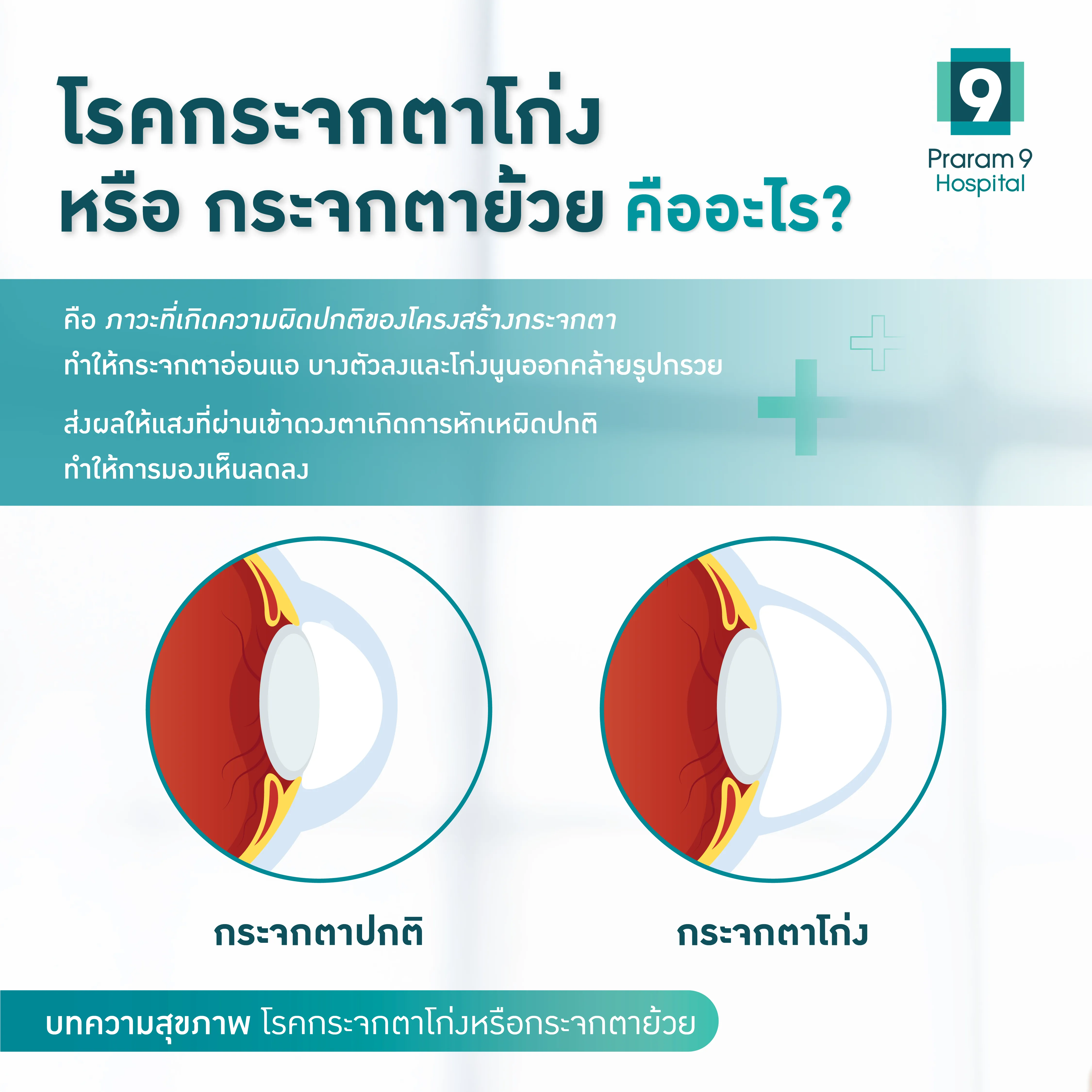 กระจกตาโก่ง หรือกระจกตาย้วย (Keratoconus) หากไม่ได้รับการวินิจฉัยและรักษาอย่างเหมาะสม อาจส่งผลต่อการมองเห็นในระยะยาวได้ การรู้จักสัญญาณเตือนและเข้ารับการตรวจวินิจฉัยโดยจักษุแพทย์ผู้ชำนาญการตั้งแต่เนิ่น ๆ จะช่วยป้องกันการเกิดภาวะแทรกซ้อน และรักษาคุณภาพการมองเห็นไว้ให้ได้นานที่สุด