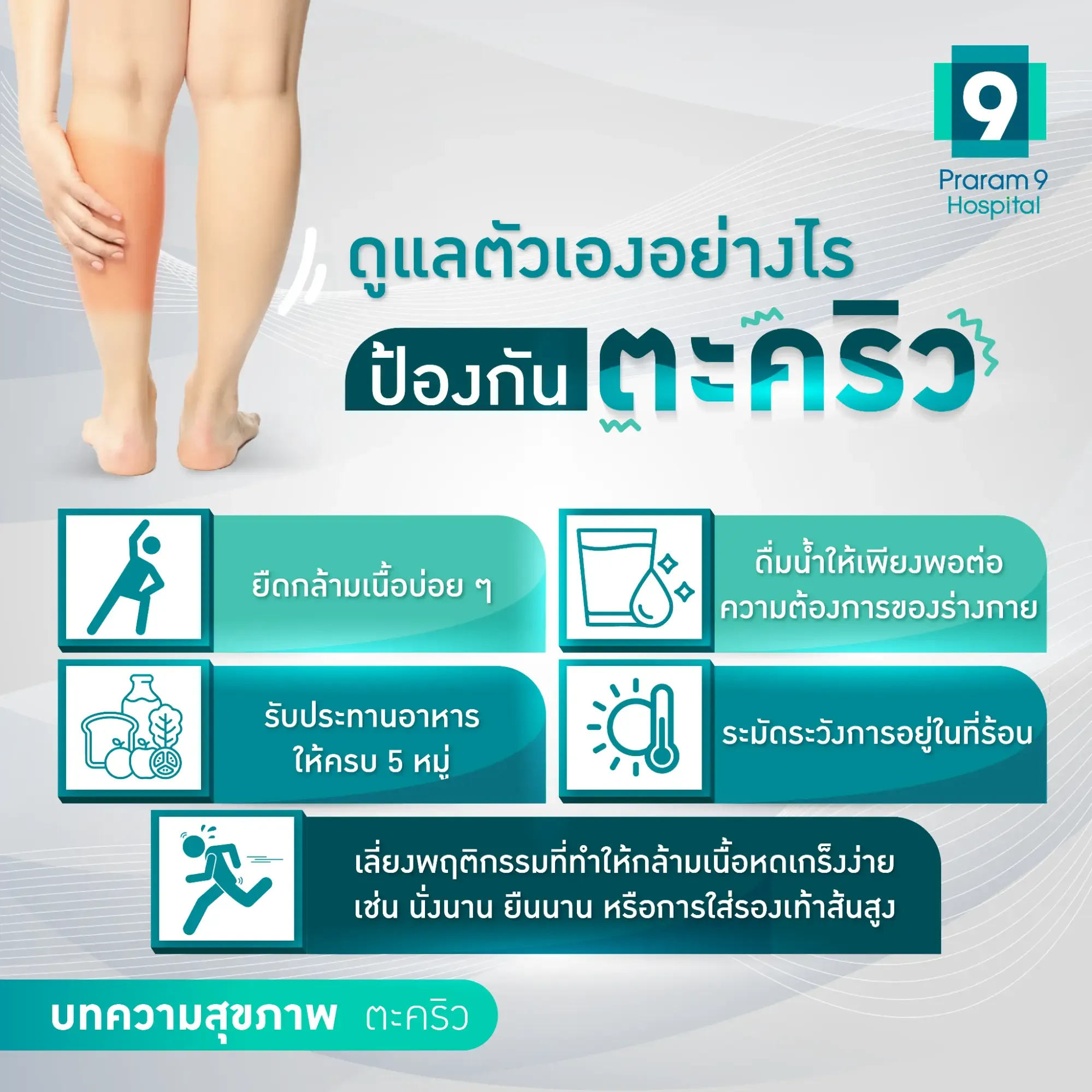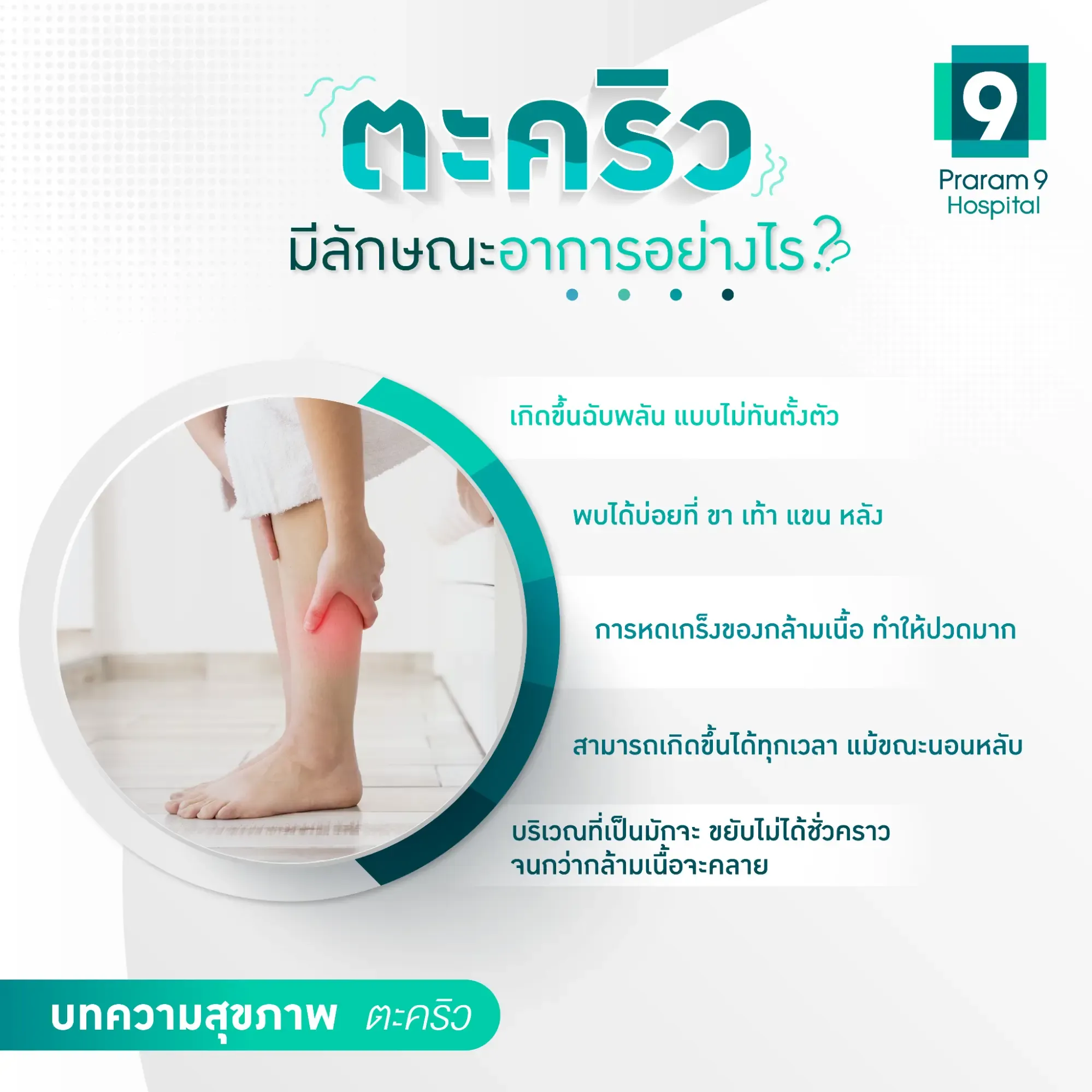 ตะคริวเป็นอาการปวดเกร็งกล้ามเนื้อที่มีโอกาสเกิดขึ้นกับทุกคน ซึ่งส่วนใหญ่แล้วมักเป็นอาการชั่วคราวที่สามารถหายเองได้โดยไม่ต้องรักษา แต่เมื่อไหร่ที่เริ่มเป็นตะคริวบ่อยขึ้นจนกระทบต่อคุณภาพชีวิต แนะนำให้พบแพทย์เพื่อตรวจวินิจฉัยหาสาเหตุ พร้อมรับการรักษาที่ตรงจุดและเหมาะสมที่สุดต่อไป