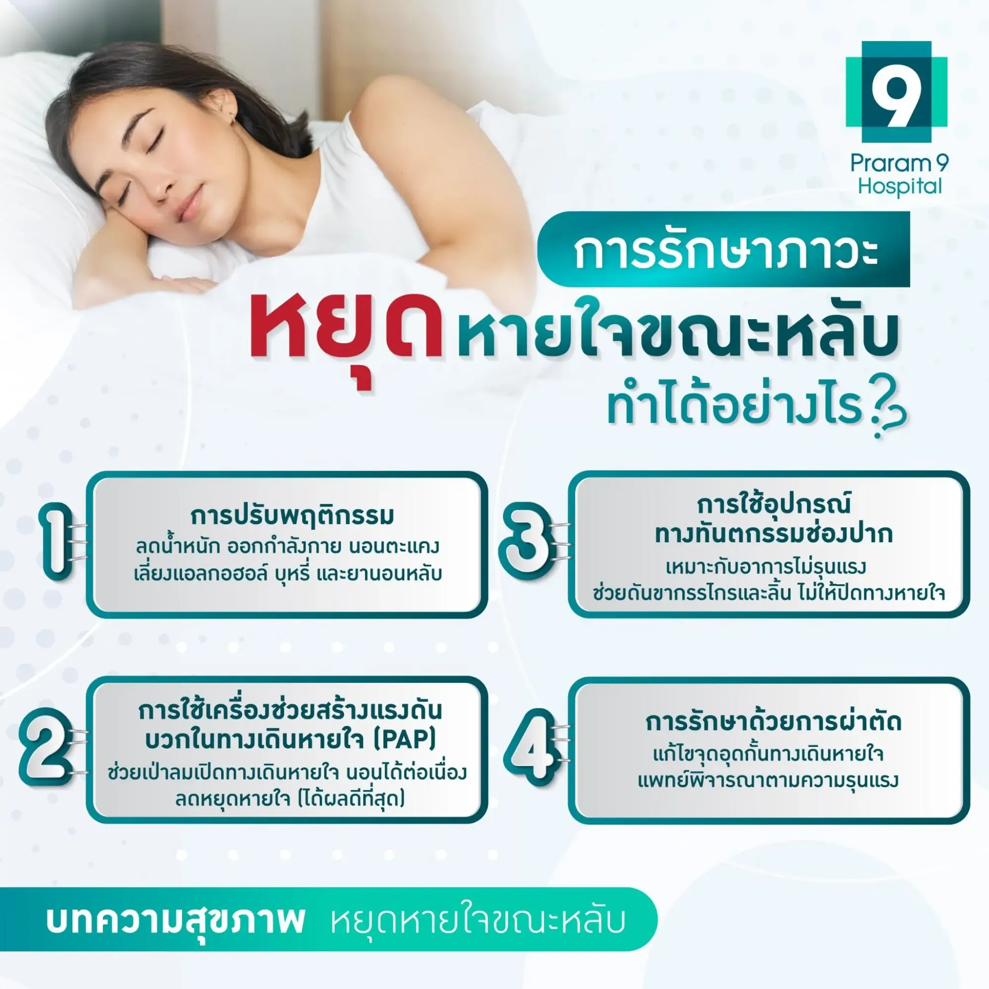 ภาวะหยุดหายใจขณะหลับเป็นความผิดปกติของการหายใจที่เกิดขึ้นระหว่างนอนหลับ ส่งผลให้เกิดอาการนอนกรนและหยุดหายใจชั่วคราว ซึ่งหากไม่ได้รับการรักษาอาจก่อให้เกิดภาวะแทรกซ้อนรุนแรงได้ การวินิจฉัยโดยการทำ Sleep Test ช่วยประเมินความรุนแรง และวางแผนการรักษาได้เหมาะสม ซึ่งทางเลือกในการรักษาที่มีประสิทธิภาพและเป็นที่นิยม ได้แก่ การปรับพฤติกรรม และการใช้เครื่องช่วยสร้างแรงดันบวกในทางเดินหายใจ (PAP)