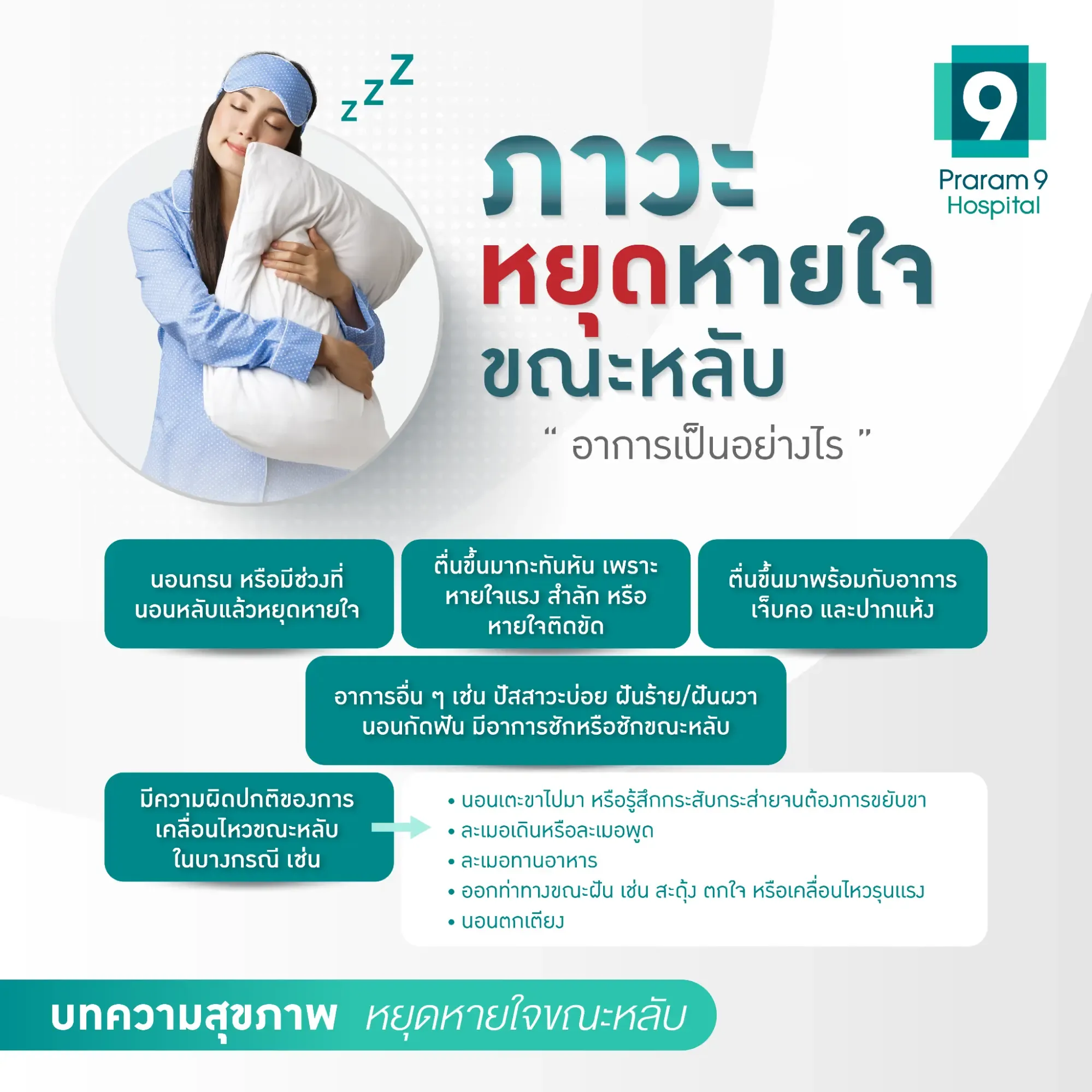 บทความนี้จะพาไปทำความรู้จักกับภาวะหยุดหายใจขณะหลับ สาเหตุที่เป็นไปได้ อาการที่สามารถสังเกตได้ ทั้งในตัวเองและคนใกล้ชิด ไปจนถึงแนวทางการรักษา เพื่อให้สามารถกลับมามีสุขภาพที่ดีอย่างยั่งยืน