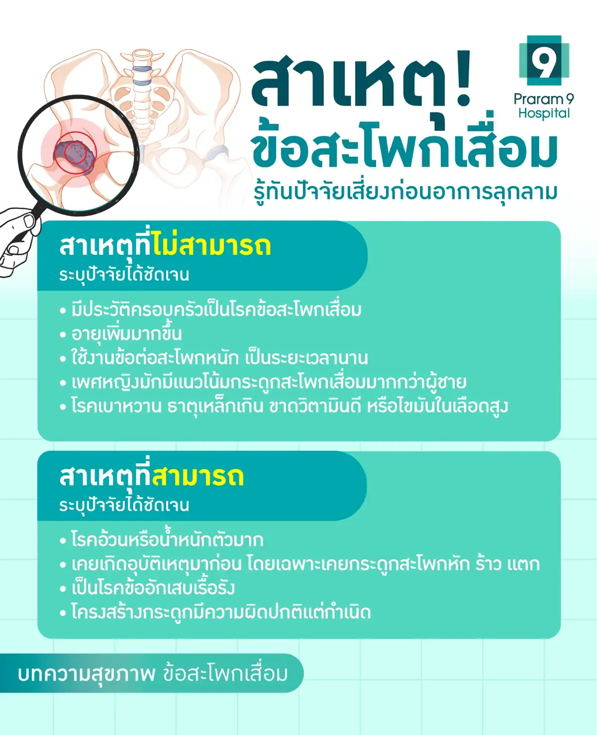 ข้อสะโพกเสื่อมเป็นภาวะที่สามารถเกิดขึ้นได้จากหลายปัจจัย บางคนอาจมีอาการโดยไม่ทราบสาเหตุแน่ชัด ในขณะที่บางกรณีมีปัจจัยที่สามารถระบุได้ชัดเจน มาดูกันว่ามีอะไรบ้างที่อาจเป็นต้นเหตุของภาวะข้อสะโพกเสื่อม