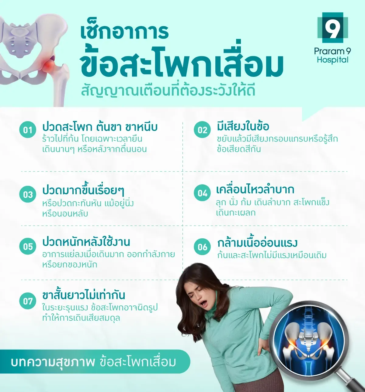 อาการปวดสะโพก เดินลำบาก หรือข้อต่อติดขัด อาจเป็นสัญญาณเตือนของภาวะข้อสะโพกเสื่อม ภาวะที่มักเกิดขึ้นแบบค่อยเป็นค่อยไปจนหลายคนละเลย หากปล่อยไว้ อาจกระทบต่อการเคลื่อนไหว การทรงตัว จนใช้ชีวิตอย่างยากลำบากมากยิ่งขึ้น เราจึงควรทำความเข้าใจว่าภาวะข้อสะโพกเสื่อมมีอาการเป็นอย่างไร? รวมถึงหาสาเหตุ และวิธีป้องกันกระดูกสะโพกเสื่อม