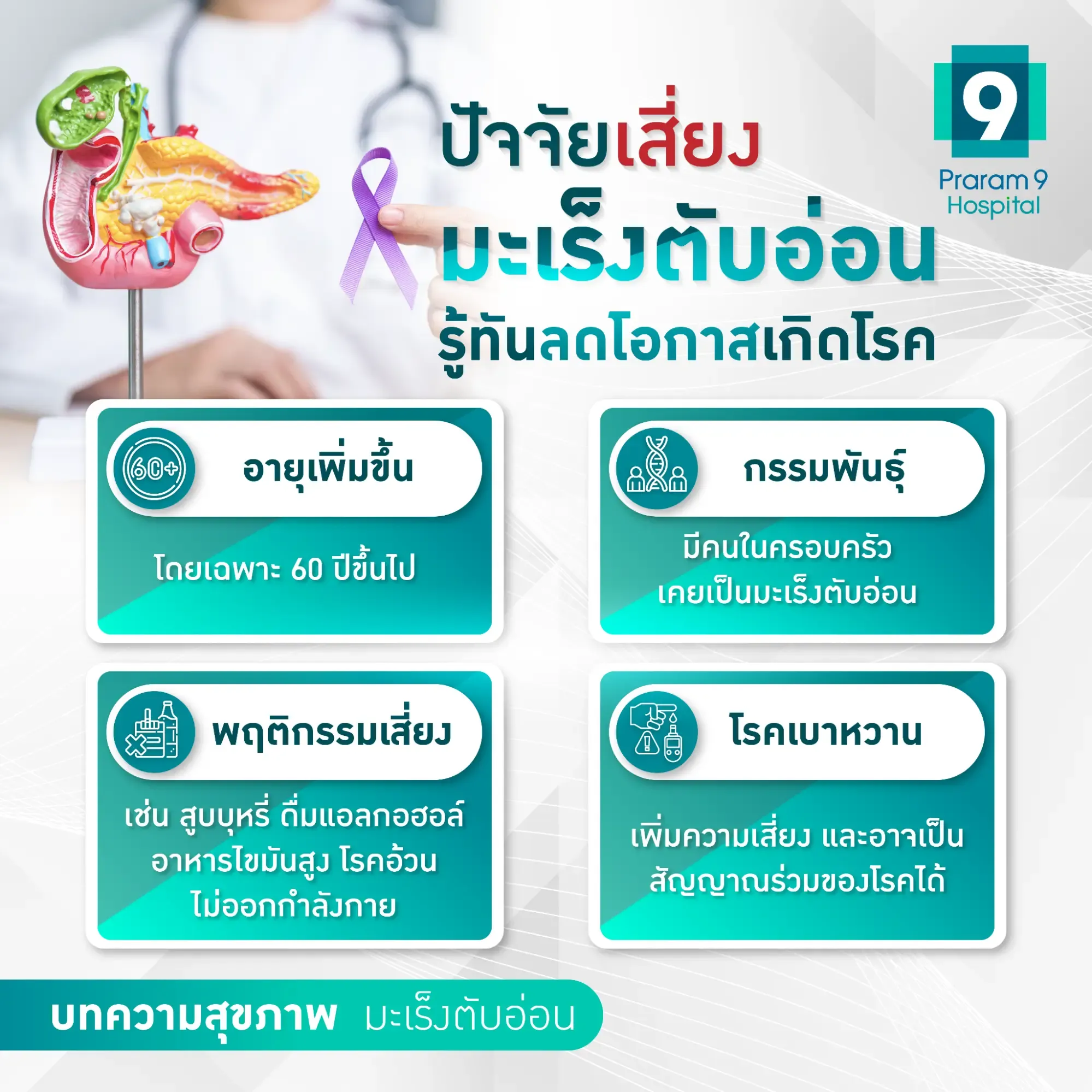 แม้มะเร็งตับอ่อนจะไม่ใช่มะเร็งที่พบบ่อยที่สุด แต่กลับเป็นโรคที่มีอัตราการเสียชีวิตสูง เนื่องจากมักไม่แสดงอาการในระยะแรก และกว่าจะตรวจพบก็มักจะสายไปเสียแล้ว การรู้เท่าทันอาการเบื้องต้น เข้าใจปัจจัยเสี่ยง และเข้ารับการตรวจวินิจฉัยตั้งแต่เนิ่น ๆ จึงเป็นสิ่งสำคัญที่จะช่วยเพิ่มโอกาสในการรักษาให้ผู้ป่วยมีโอกาสรอดชีวิตสูงยิ่งขึ้น