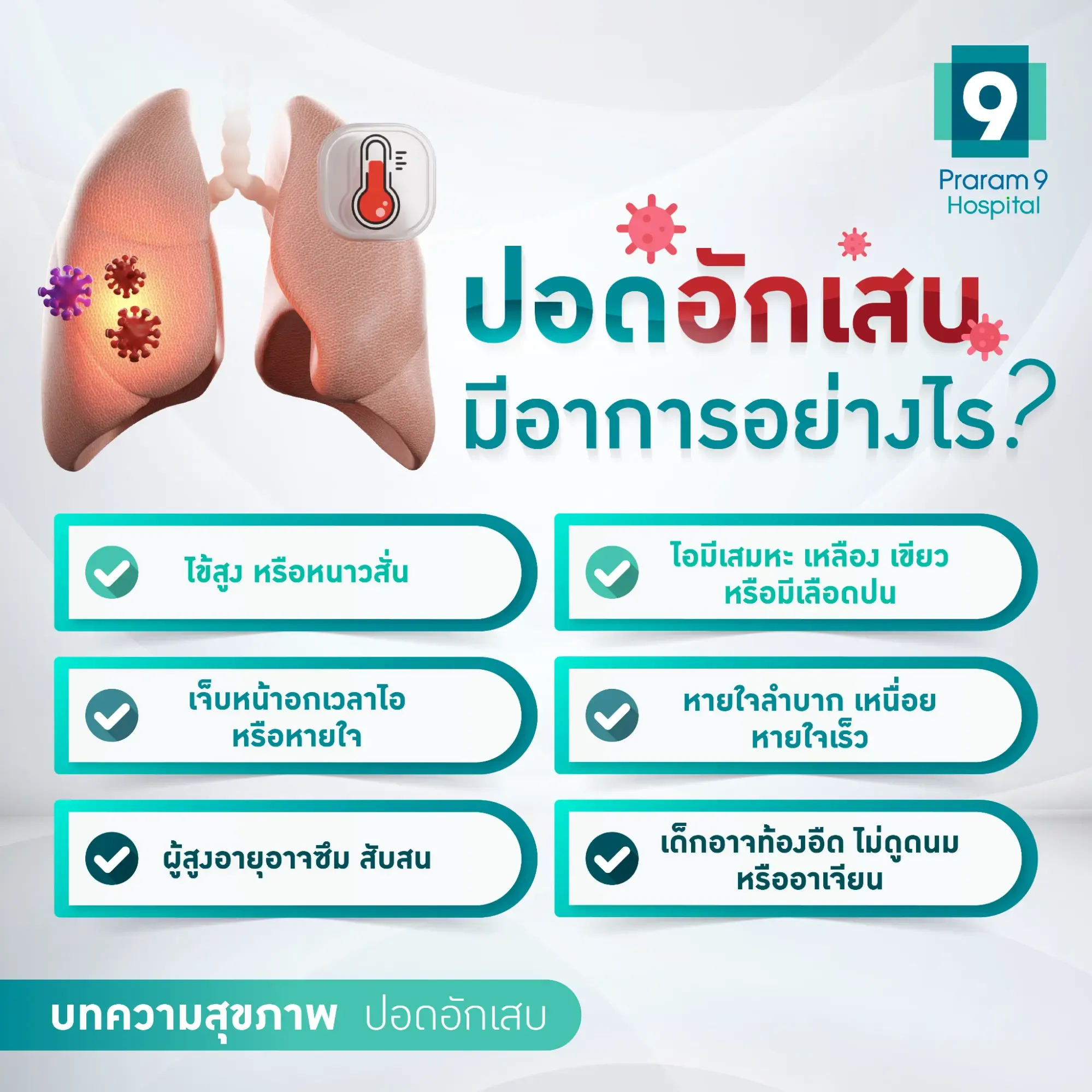 • สัญญาณเตือนที่สำคัญของปอดอักเสบ คือ ไข้สูง หนาวสั่น ไอมีเสมหะ หอบ และเจ็บหน้าอกขณะหายใจ ซึ่งในกลุ่มเด็กและผู้สูงอายุอาจมีอาการซึมหรือสับสนร่วมด้วย