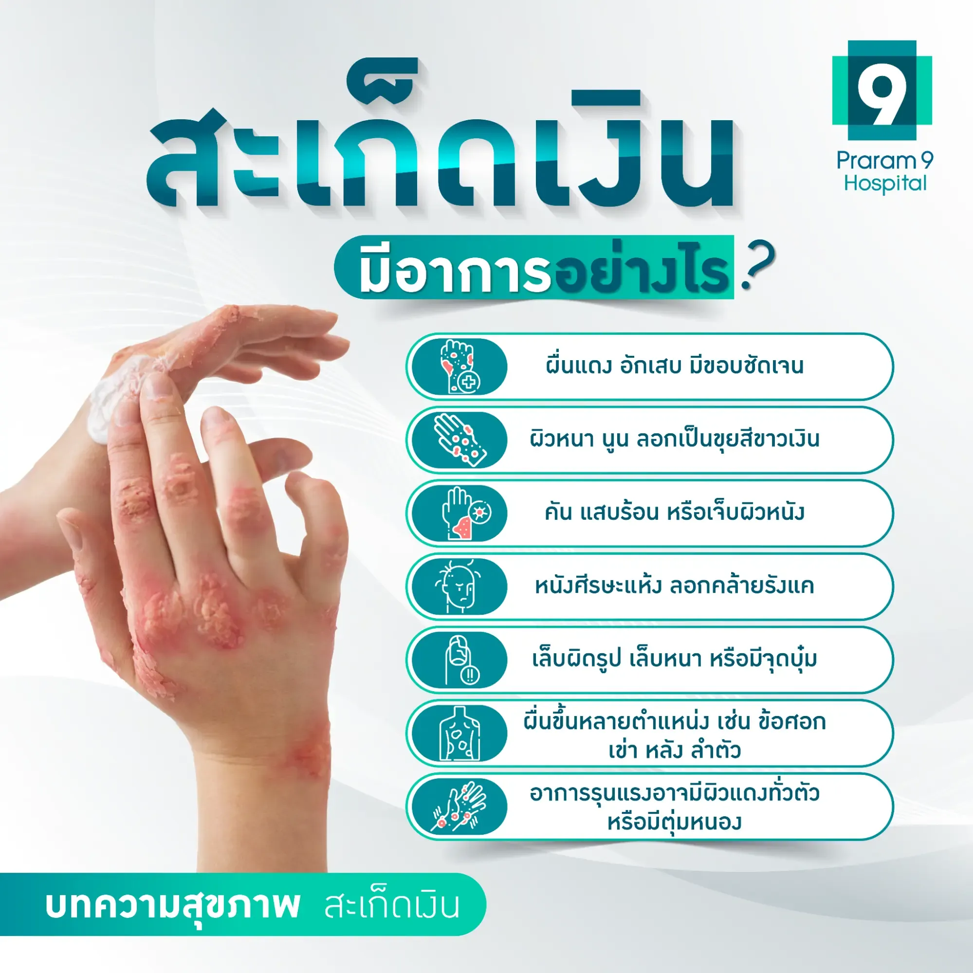 - โรคสะเก็ดเงินไม่ใช่โรคติดต่อ แต่เป็นโรคผิวหนังอักเสบเรื้อรังจากภูมิคุ้มกันทำงานผิดปกติ ทำให้เกิดผื่นแดง หนานูน และลอกเป็นขุย พบได้หลายตำแหน่งทั่วร่างกาย