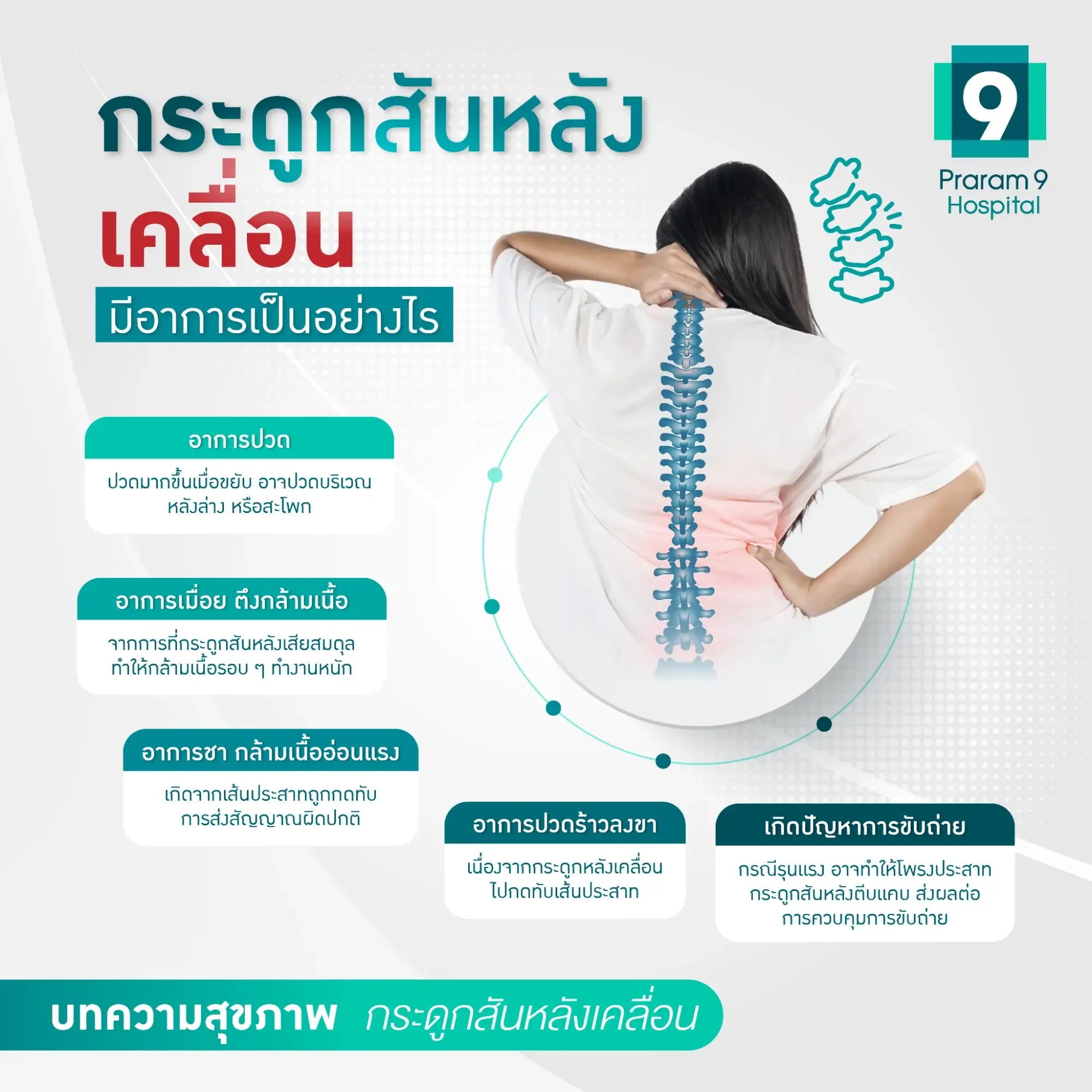 กระดูกสันหลังเคลื่อนเป็นภาวะที่สามารถเกิดขึ้นได้กับทุกคน ไม่ว่าจะจากการเสื่อมตามวัย การใช้งานหลังอย่างหนัก หรืออุบัติเหตุ หากเริ่มมีอาการปวดหลังเรื้อรัง ปวดร้าวลงขา หรือรู้สึกชาตามแนวขา ควรรีบพบแพทย์เพื่อตรวจวินิจฉัยอย่างถูกต้อง เพราะหากปล่อยไว้อาจทำให้อาการรุนแรง และส่งผลต่อการใช้ชีวิตประจำวันได้