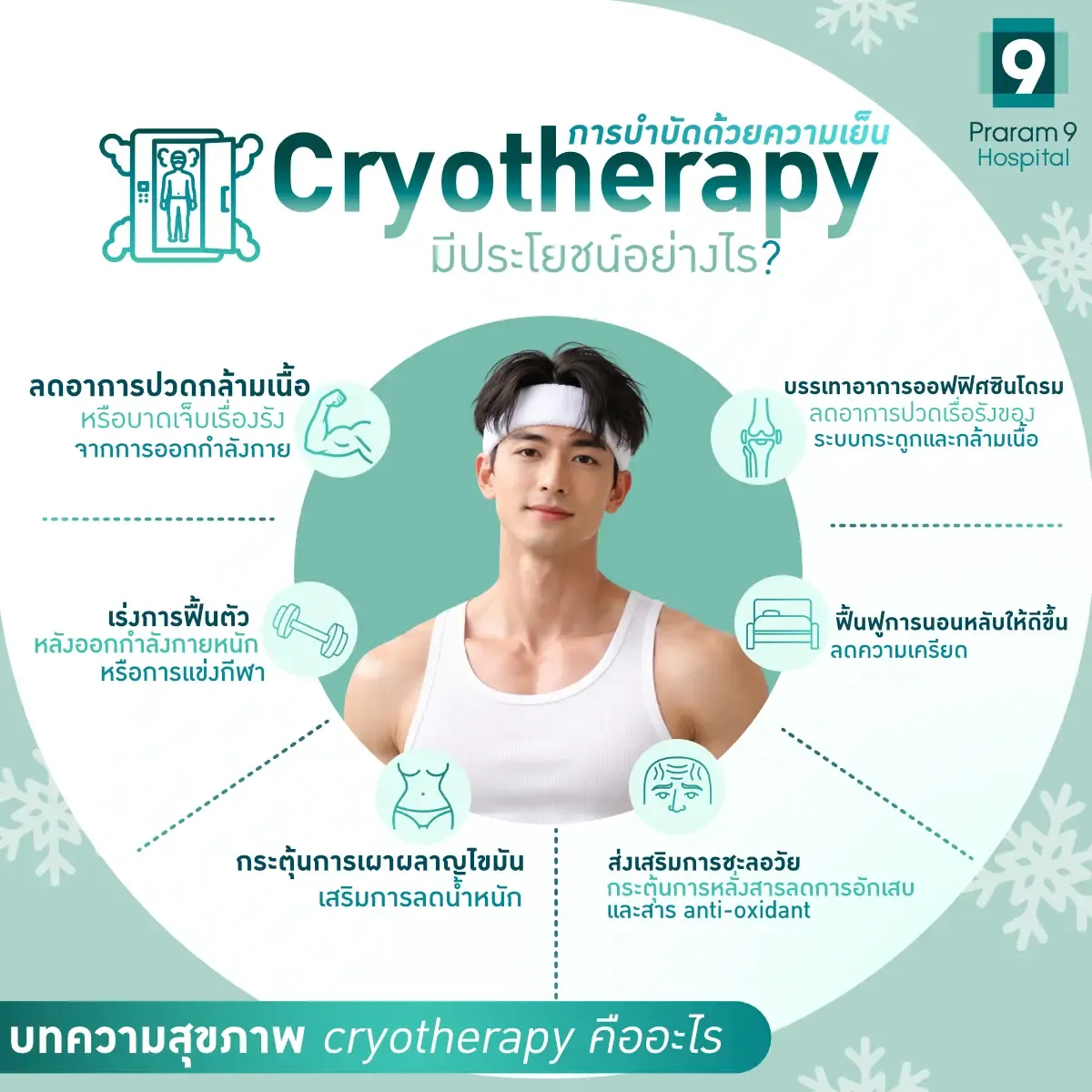 - การทำ Cryotherapy ถือเป็นแนวทางการฟื้นฟูร่างกายที่ไม่ต้องผ่าตัด ลดระยะเวลาการพักฟื้น ไม่ส่งผลกระทบต่ออวัยวะภายในร่างกาย