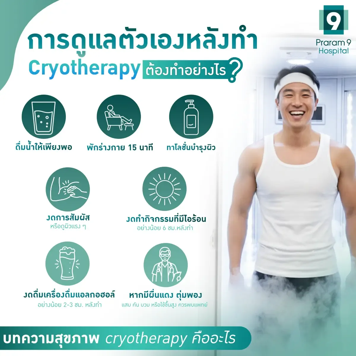 - งดทำกิจกรรมที่มีไอร้อน เช่น การอบซาวน่า การแช่น้ำอุ่น อย่างน้อย 6 ชั่วโมงหลังทำ Cryotherapy
