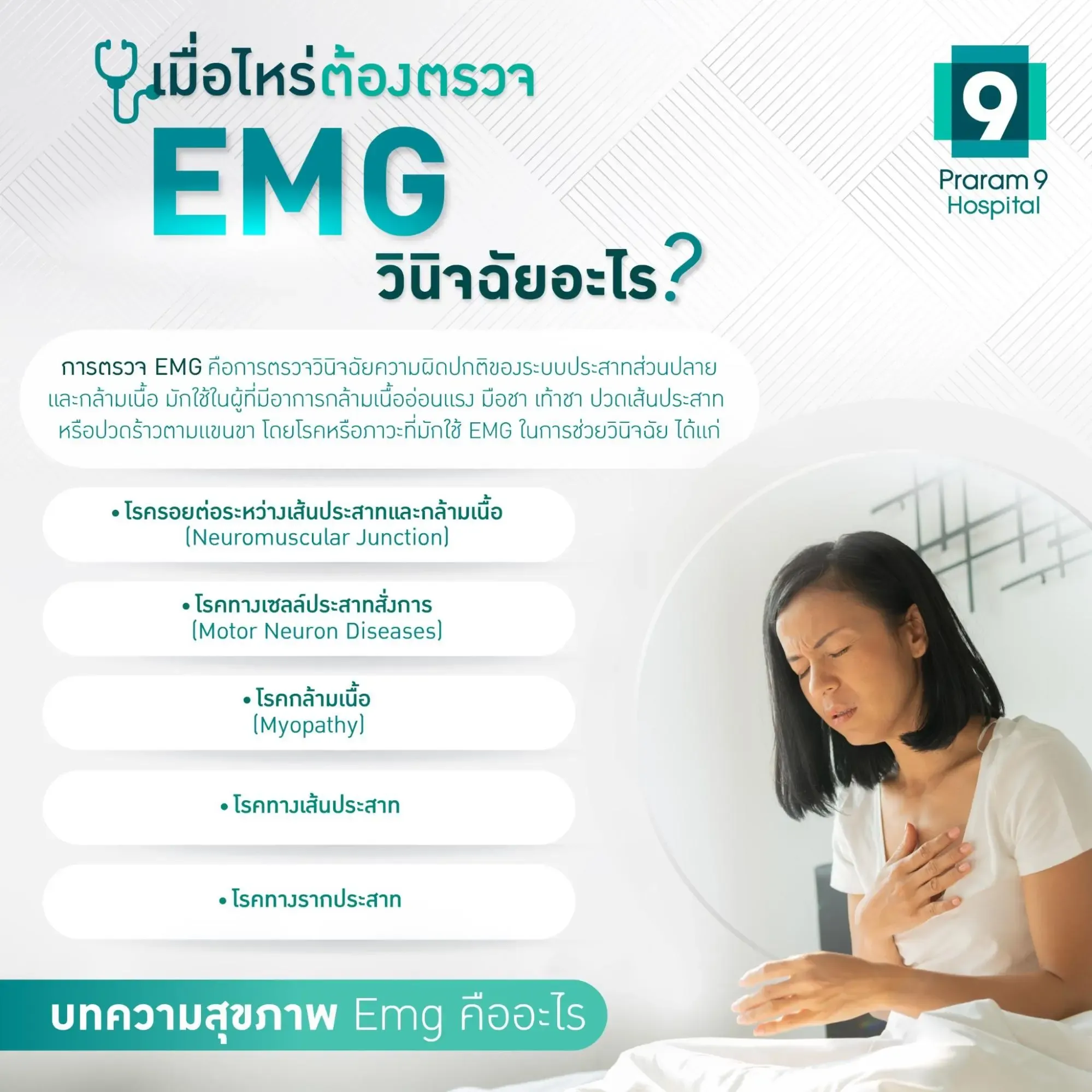 EMG คือการตรวจประเมินการทำงานของกล้ามเนื้อและเส้นประสาท สามารถช่วยวินิจฉัยโรคได้หลากหลาย เช่น โรคหมอนกระดูกเคลื่อนทับรากประสาท กระดูกคอเสื่อม กล้ามเนื้ออักเสบ หรือโรคกล้ามเนื้ออ่อนแรง (Myasthenia Gravis) โดยการตรวจนี้มีความปลอดภัยสูง สามารถทำได้ทั้งเด็กและผู้ใหญ่