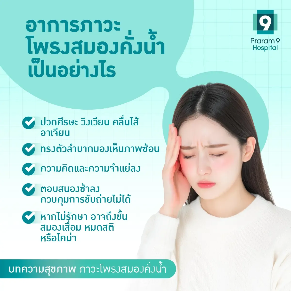 หากคุณสงสัยว่าตัวเองหรือคนใกล้ตัวอาจมีภาวะโพรงสมองคั่งน้ำ สามารถเข้ารับคำปรึกษาได้ที่ศูนย์สมองและระบบประสาท โรงพยาบาลพระรามเก้า ซึ่งมีทีมแพทย์คอยให้การดูแลอย่างใกล้ชิด พร้อมเทคโนโลยีทางการแพทย์ที่ทันสมัย และบริการที่เพียบพร้อมจะช่วยเหลือในทุกขั้นตอน