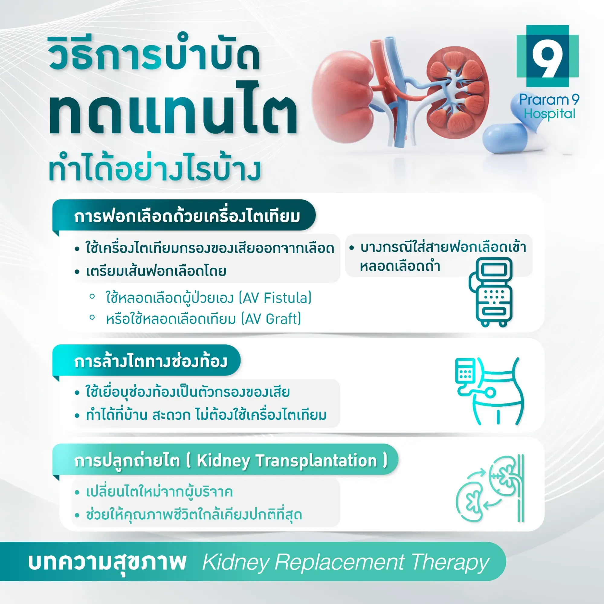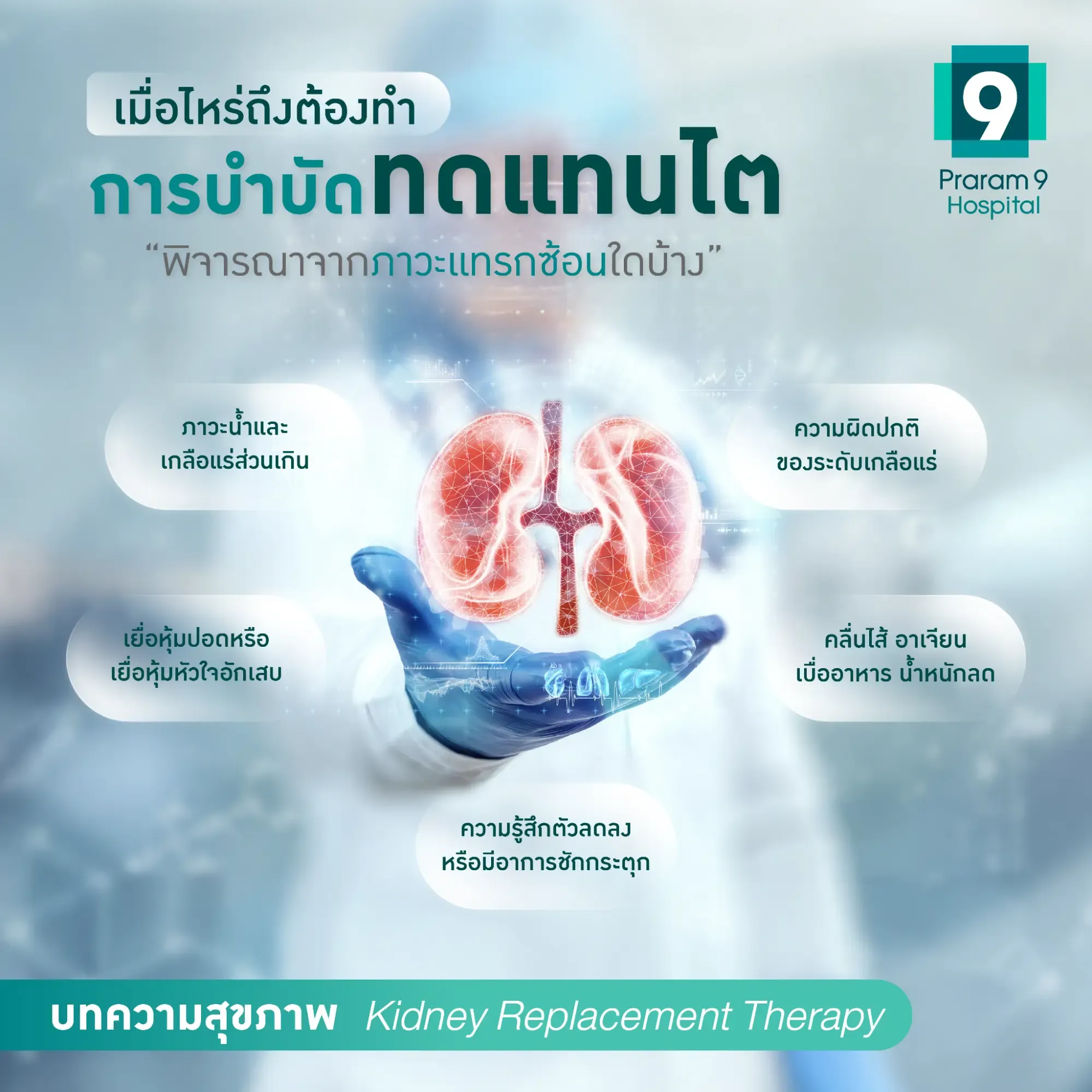 หากคุณและครอบครัวกำลังเผชิญกับภาวะไตวาย และต้องการข้อมูลเพิ่มเติมเกี่ยวกับการรักษาที่ครอบคลุม สามารถขอคำปรึกษาจากทีมแพทย์ผู้เชี่ยวชาญได้ที่สถาบันโรคไต โรงพยาบาลพระรามเก้า เพื่อเข้ารับการวินิจฉัยและวางแผนการรักษาที่เหมาะสมที่สุดสำหรับคุณ
