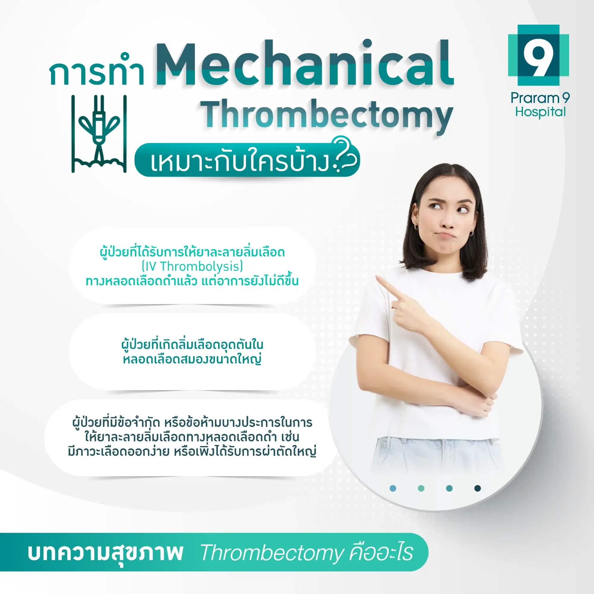 ที่ ศูนย์สมองและระบบประสาท โรงพยาบาลพระรามเก้า มีบริการรักษาโรคหลอดเลือดสมองแบบครบวงจร โดยทีมแพทย์ผู้เชี่ยวชาญด้านรังสีร่วมรักษาระบบประสาท (Interventional Neuroradiology) สามารถทำการรักษาด้วยวิธี Mechanical Thrombectomy เพื่อดูดหรือดึงลิ่มเลือดออกจากหลอดเลือดสมองที่อุดตันได้อย่างรวดเร็ว และมีประสิทธิภาพสูงสุด