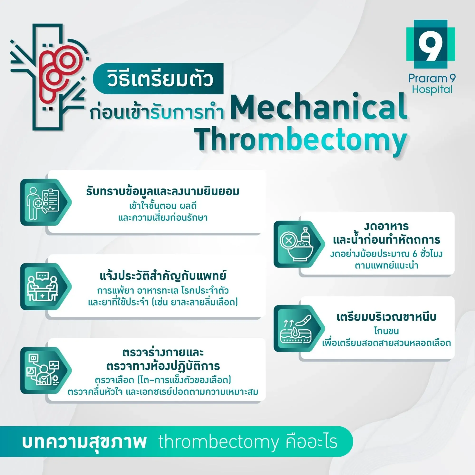 การเตรียมความพร้อมก่อนการทำ Mechanical Thrombectomy คือขั้นตอนสำคัญเพื่อให้การรักษาเป็นไปอย่างราบรื่นและปลอดภัยที่สุด ผู้ป่วยส่วนใหญ่มักมีอาการแบบฉุกเฉิน แต่ก็จำเป็นต้องมีการประเมินและเตรียมตัวในด้านต่าง ๆ อย่างรวดเร็ว