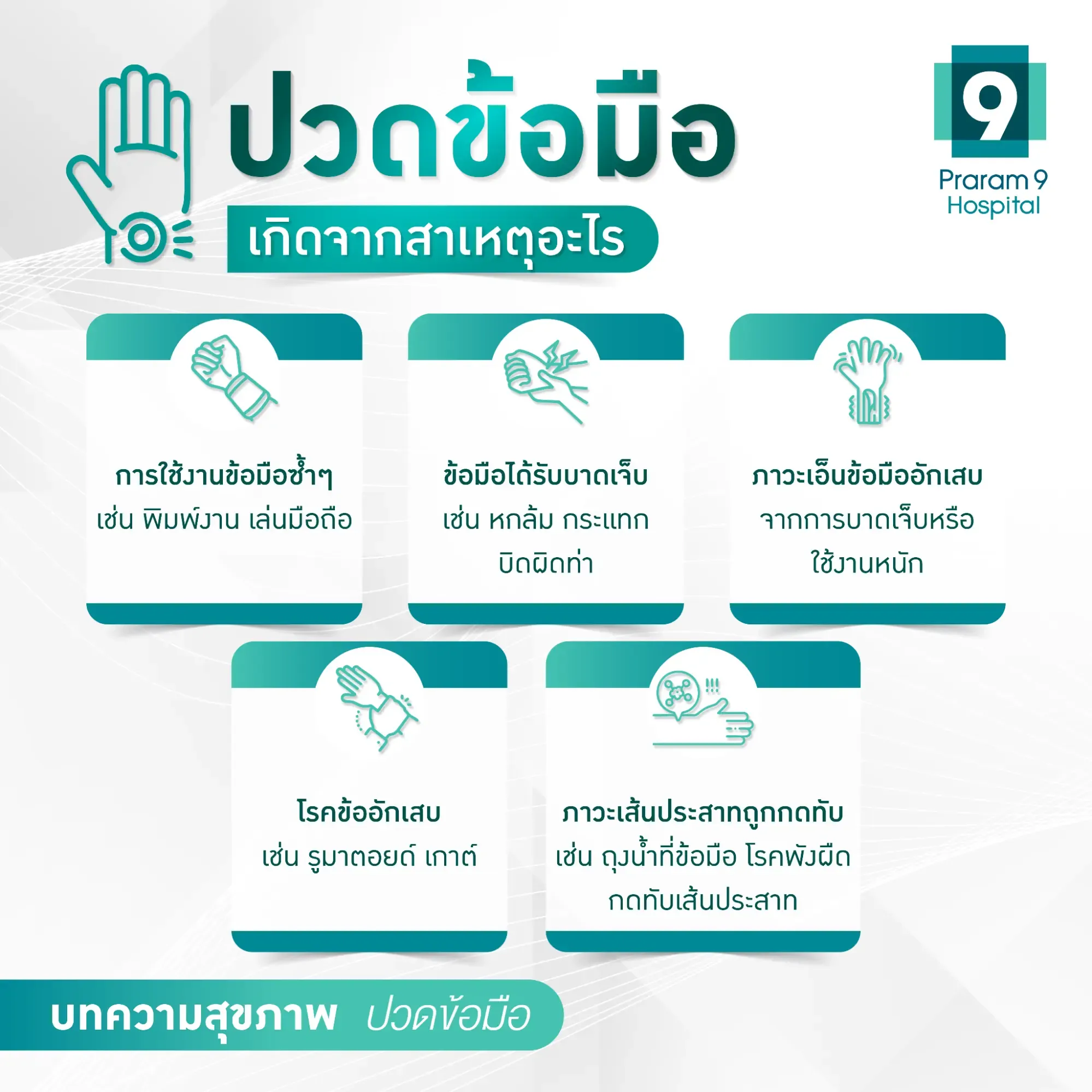 อาการปวดข้อมืออาจดูเป็นเรื่องเล็กน้อย แต่หากปล่อยทิ้งไว้จนเรื้อรัง อาจส่งผลกระทบอย่างมากต่อคุณภาพชีวิต และอาจเป็นสัญญาณของโรคอื่น ๆ ได้อีกหลายโรค หากคุณมีอาการปวดข้อมือที่ไม่หายขาด สามารถเข้ารับการตรวจรักษาที่ศูนย์กระดูกและข้อ โรงพยาบาลพระรามเก้า เรามีทีมแพทย์เฉพาะทางที่มีความชำนาญในการวินิจฉัย และรักษาโรคเกี่ยวกับข้อและกระดูก พร้อมด้วยเทคโนโลยีทางการแพทย์ที่ทันสมัย เพื่อให้คุณกลับมาใช้ชีวิตได้อย่างปกติโดยเร็ว