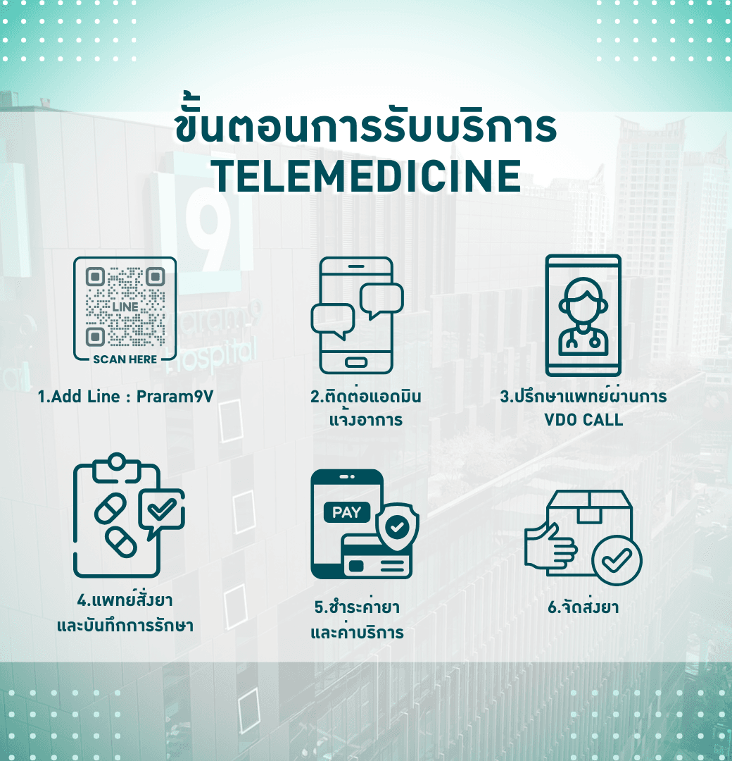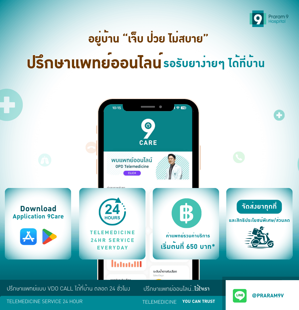 ศูนย์โรงพยาบาลออนไลน์ โรงพยาบาลพระรามเก้า ให้บริการ Telemedicine ในรูปแบบ Virtual Hospital ที่พัฒนาขึ้นเพื่อตอบโจทย์การดูแลสุขภาพในยุคดิจิทัล ช่วยให้ผู้รับบริการสามารถ ปรึกษาแพทย์ออนไลน์ พบแพทย์เฉพาะทาง รับคำแนะนำทางการแพทย์ ติดตามผลการรักษา และรับยาถึงบ้าน ได้อย่างสะดวก ปลอดภัย และต่อเนื่อง